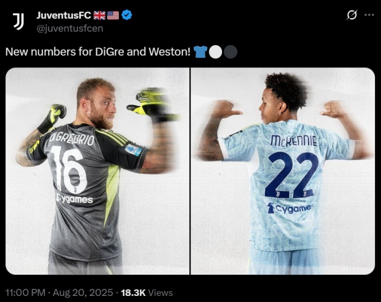 8月21日讯 尤文官宣,迪格雷戈里奥以及麦肯尼更换号码。